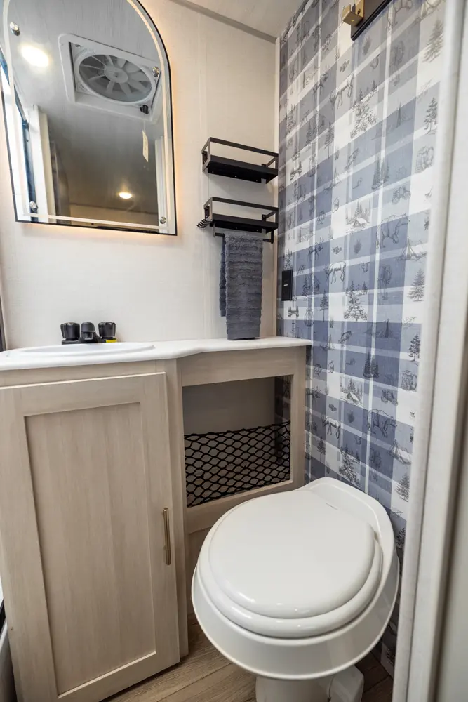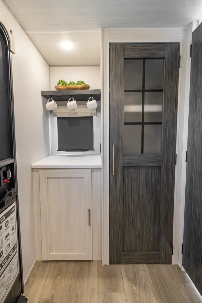 The RP-206 combines comfort and functionality in a smart, modern layout. A front queen bed offers restful sleep, while the rear full bathroom and full-size pantry add convenience and storage on the road. The kitchen is well-equipped with a bar top and flip-up window, convection microwave, and 12V refrigerator, making meal prep easy. Inside, theater seating provides a comfortable living space. Outside, enjoy a 13' power awning and hot & cold spray port—ideal for compact adventures.