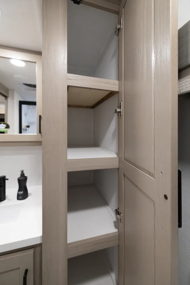 This unit is unique with its big 36" sliding doors leading to the bathroom and bedroom. These doors make moving around for a broad-shouldered person easier and comfortable. The entertainment center is loaded with 32" tv, a residential-style soundbar and a fireplace space heater. Across from this lovely entertainment center is a 72" theatre seating which is perfect for reclining and watching a good movie.