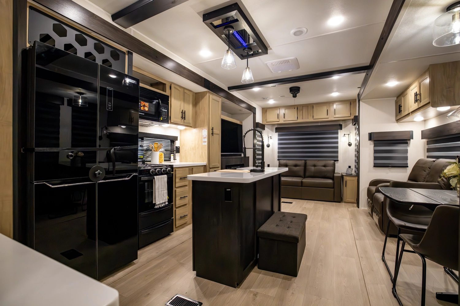 • Cherokee Black Label Timberwolf (Deep Tinted Frameless Automotive Glass Windows, High Gloss Gel Coat Exterior Sidewalls, Multicolor Reading Lights, Pillowtop Mattress Upgrade, Thermo Foil Arctic Insulation, Wall Controlled Power Shades for Living Room and Kitchen)